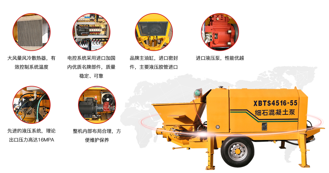 2018年我公司經過近10年的技術積累和市場調研又陸續開發了XBTS50-55細石混凝土兩用泵和XBTS4516-55高壓細石混凝土泵兩款新產品,XBTS50-55既可以泵送標準混凝土又可以泵送細石混凝土,特別適合地下車庫及大面積地面施工,施工效率高,XBTS4516-55高壓細石混凝土泵理論出口壓力達到16Mpa,主要面向超高樓層的細石混凝土泵送,泵送高度可達200米。